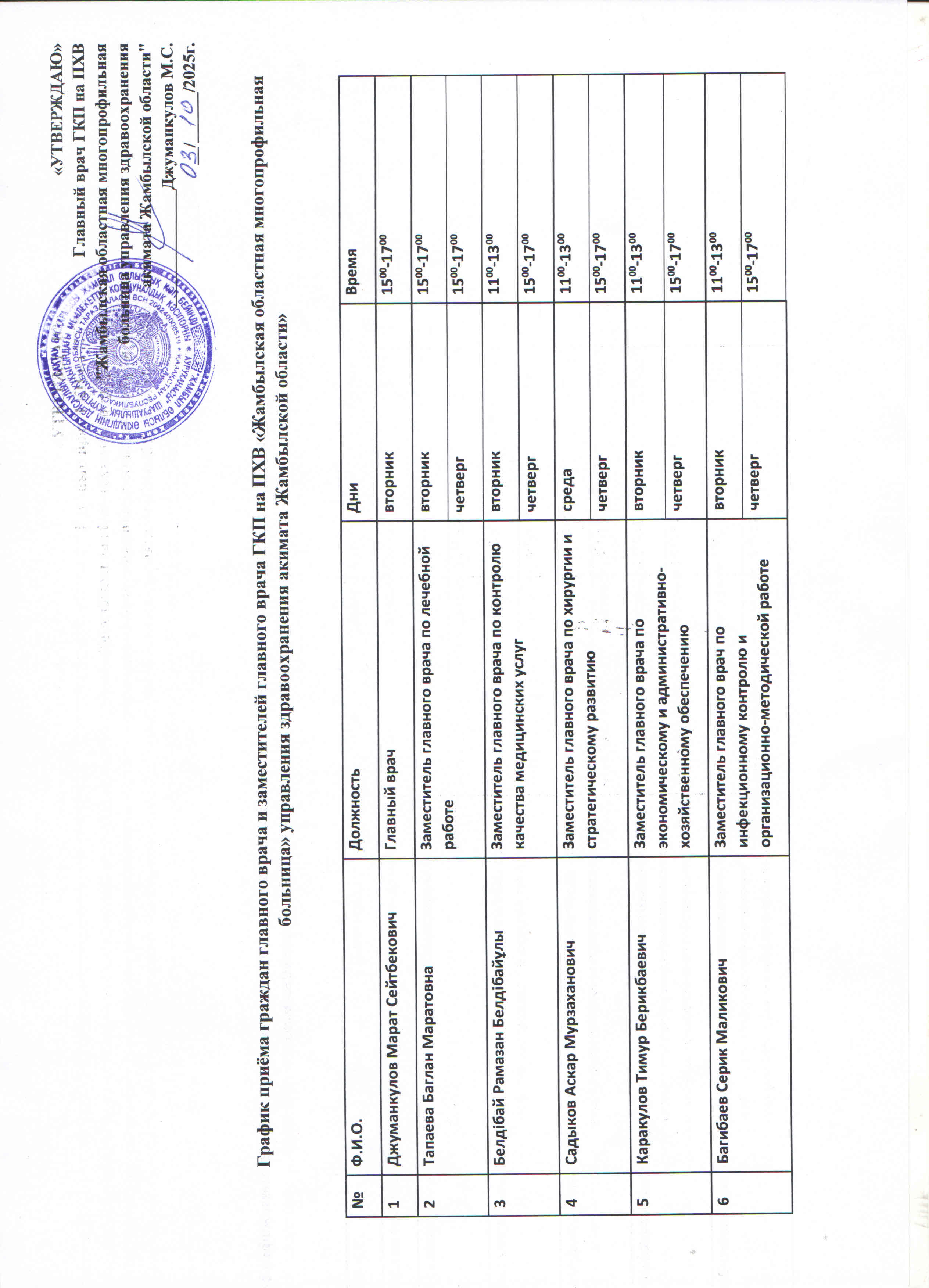 Бас дәрігердің және бас дәрігердің орынбасарларының азаматтарды қабылдау кестесі
